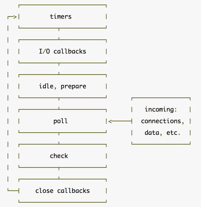 当nodejs启动时,会初始化Event Loop,每一个Event Loop都会包含如下六个循环阶段,并按顺序执行。