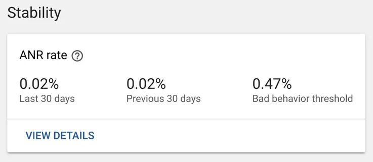 使用收集到的有关你应用 ANR 事件的匿名数据,Android vitals 提供了有关 ANR 的多个级别的详细信息。主屏幕显示你应用程序中发生 ANR 的 Activity 的概况。这显示了用户经历过至少一次 ANR 的每日会话的百分比,以及之前最近 30 天的单独报告。还提供了不良行为的阈值。