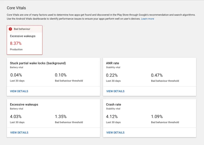 了解你的应用是否在驱动过多的唤醒是 Android vitals 的重要任务。收集的有关你应用行为的匿名数据用于显示自设备完全充电后,每小时经历超过 10 次唤醒的用户的百分比。要查看的关键点是一个红色的图标;这个图标告诉你,你的应用已超出不良行为阈值。而这个阈值表示你的应用属于 Google Play 上表现较差的应用,你应该考虑改善其行为。