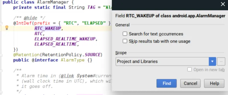 你还可以在 Find Usages 选项中将范围设置为“项目和库”,以确定你的依赖库是否使用了 AlarmManager API。如果是,你应该考虑使用替代库或向作者报告这个问题。