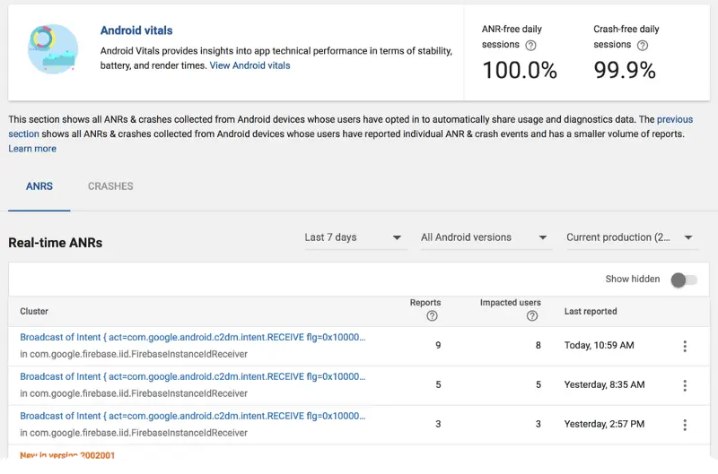 你还可以从 ANRs & crashes 部分获取更多详细信息。