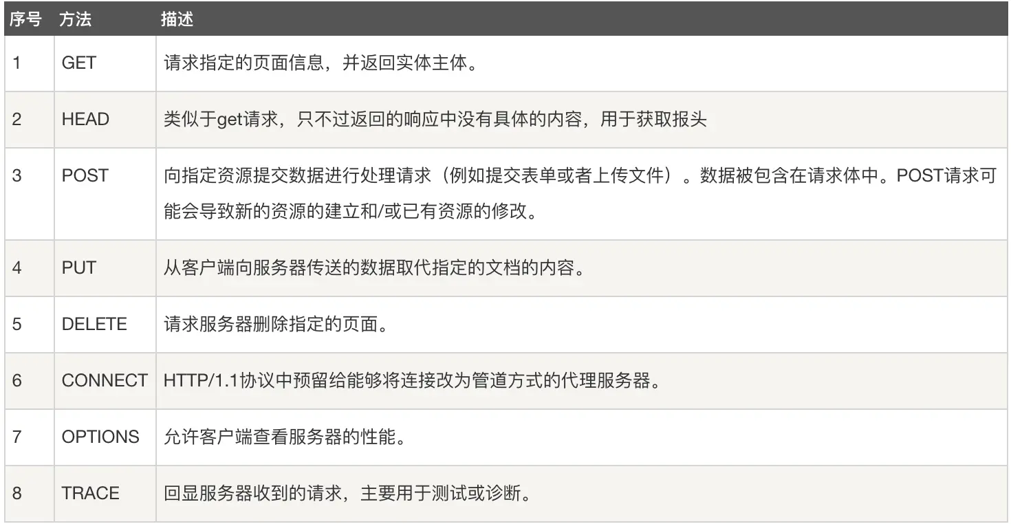 GET 获取资源 POST 向服务器端发送数据,传输实体主体 PUT 传输文件 HEAD 获取报文首部 DELETE 删除文件 OPTIONS 询问支持的方法 TRACE 追踪路径 协议/版本号 URL - 请求头