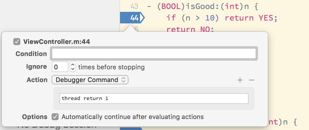 特别是在某些依赖服务端数据的时候,我们想要调整逻辑就需要在代码里写死一些数据来保证逻辑按照我们预期的执行,这样做的弊端就是逻辑调完之后忘记把死数据给去掉了,很尴尬,这时候用lldb就相当受用了。结合Xcode中在断点中执行lldb指令的功能,简直可以随心所欲的修改程序了。比如我们想要 isGood 函数总是返回YES ,右键点击断点的蓝色标志选择Edit Breakpoint… ,点击Add Action 增加一条Debugger Commander ,thread return 1 ,如下图所示: