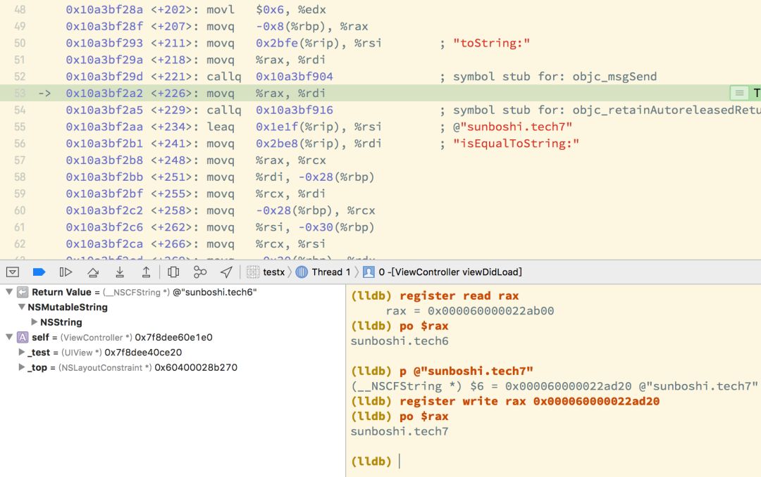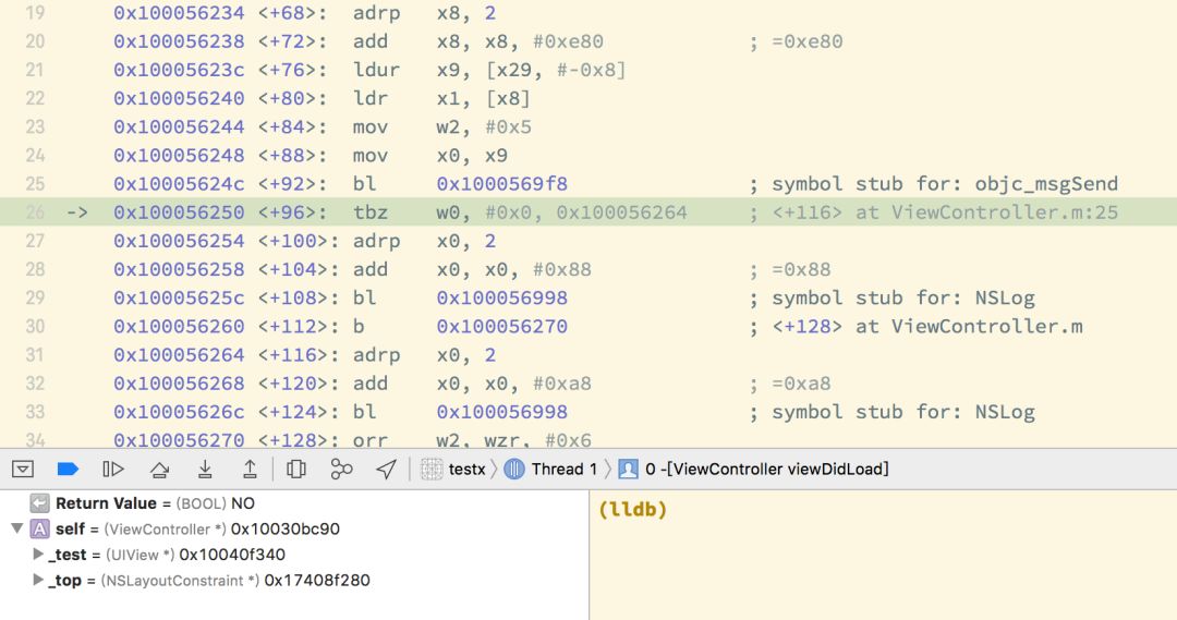 需要说明一下,在lldb中register 可以简写成reg ,又可以少输入几个字符。简单总结一下就是在不管是在x86还是arm架构下,函数的返回值都是存在寄存器中,x86是在rax寄存器中,arm是在x0寄存器中,我们利用Xcode的F8快捷键,将程序暂停在函数执行结束后的指令,然后利用register write 来修改寄存器值从而达到修改函数返回值的目的。