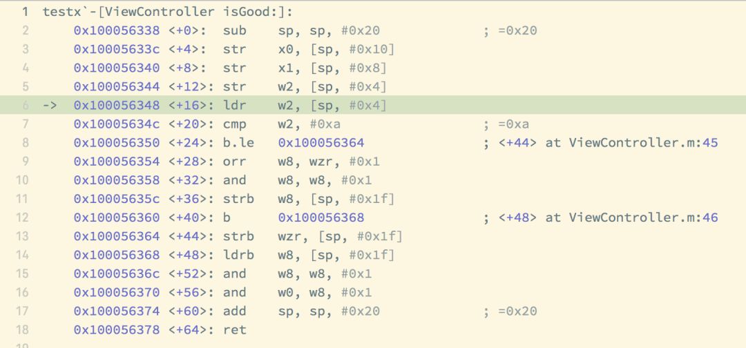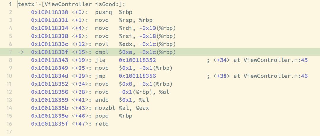 然后运行工程,当执行到isGood函数时,点击Debug->Debug Workflow->Always Show Disassembly,这时会显示isGood函数的汇编代码如下所示: