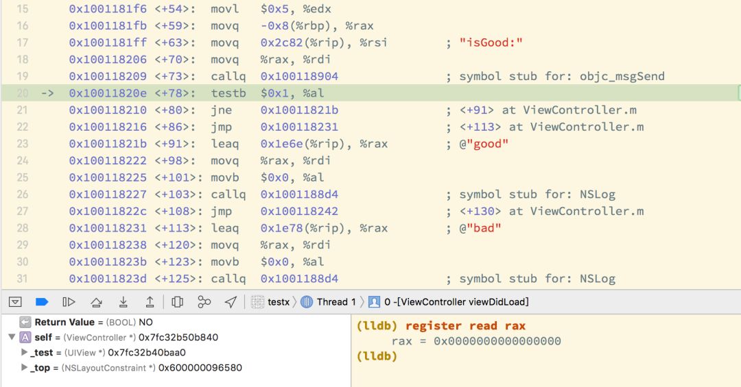 需要说明的是,项目是在模拟器里面执行的,是x86的架构体系,在x86下,函数的返回值是保存在rax(eax) 寄存器中,所以如果需要修改函数的返回值,只要直接修改rax的值就行了,使用如下命令将rax改为1,也就是YES。