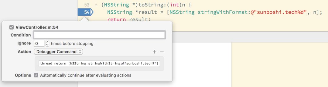 这是告诉lldb,执行到该断点时直接退出函数,并且返回1。注意勾选Automatically continue after evaluating actions ,这样修改完函数返回值后就会继续执行流程,不会停在断点处,可以根据实际情况选择是否需要。