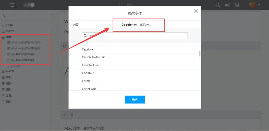比如,Mockplus DS不仅支持丰富的图片格式上传(例如PNG, JPG, JPRG, GIF, SVG等常见图片格式),还提供了强大的Google和系统字体库,能够轻松帮助设计师定制符合公司和产品特色的设计规范体系。如图: