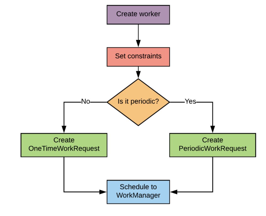 WorkRequest:代表一个单独的任务。至少,WorkRequest对象指定应该执行任务的Worker类。但是,您也可以向WorkRequest对象添加细节,指定任务应该运行的环境。每个工作请求都有一个自动生成的唯一ID;您可以使用ID来执行诸如取消排队任务或获取任务的状态等操作。WorkRequest是一个抽象类;在您的代码中,您将使用一个直接子类,一个timeworkrequest(一次性)或PeriodicWorkRequest(周期性)。