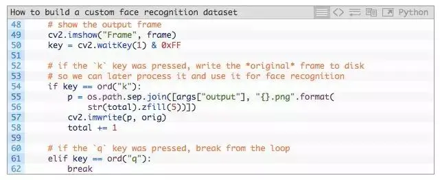 - 如果按下「k」键,我们将保留视频帧并将它存储到磁盘上(第 53-56 行),并且增加表示获取到的总帧数的计数器 total(第 58 行)。我们需要在想保留的每一帧处按下「k」键。我建议保留不同角度、不同的帧区域、戴/不戴眼镜等不同情况下拍摄的人脸图像。