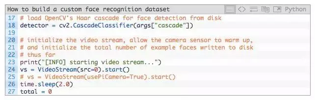 在第 18 行中,我们加载了 OpenCV 的哈尔级联 detector。这个 detector 会在接下来的逐帧循环中完成繁重的任务。