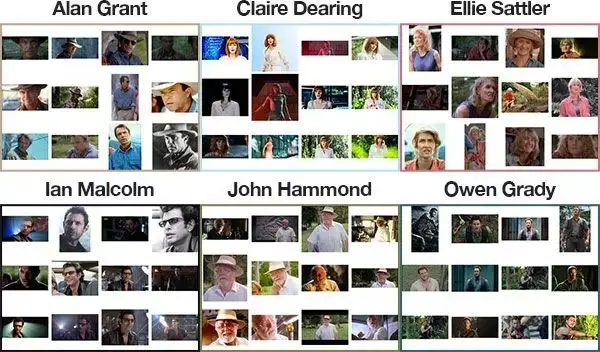 图 3:通过 Python 和 Bing 图像搜索 API 以编程的方式创建出的人脸识别数据集示例。图中是《侏罗纪公园》系列电影中的六个人物。