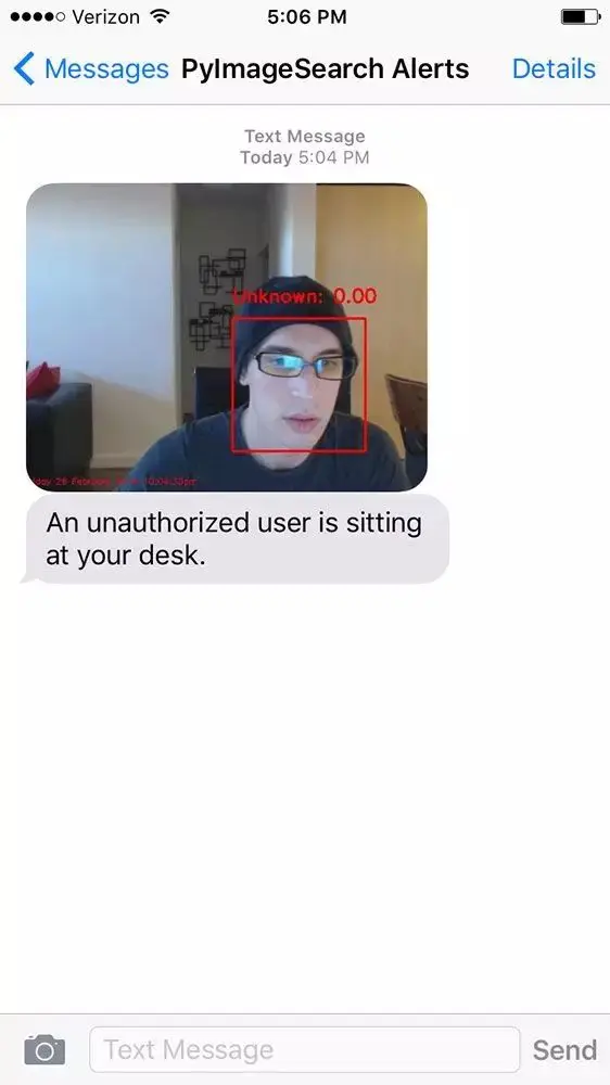 图 5:在 PyImageSearch Gurus 课程(www.pyimagesearch.com/pyimagesear…)中,你将学会构建人脸识别安防系统。当一个未经授权的入侵者坐在你的桌前时,它会通过文本消息(包含图像)提醒你。