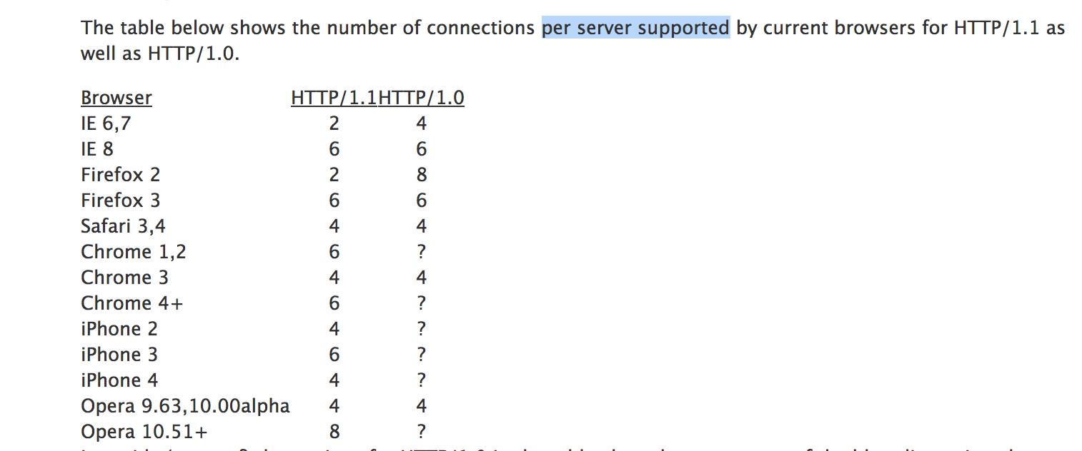 在不同浏览器中,同域名下的资源会有有并发限制,如下列表中显示