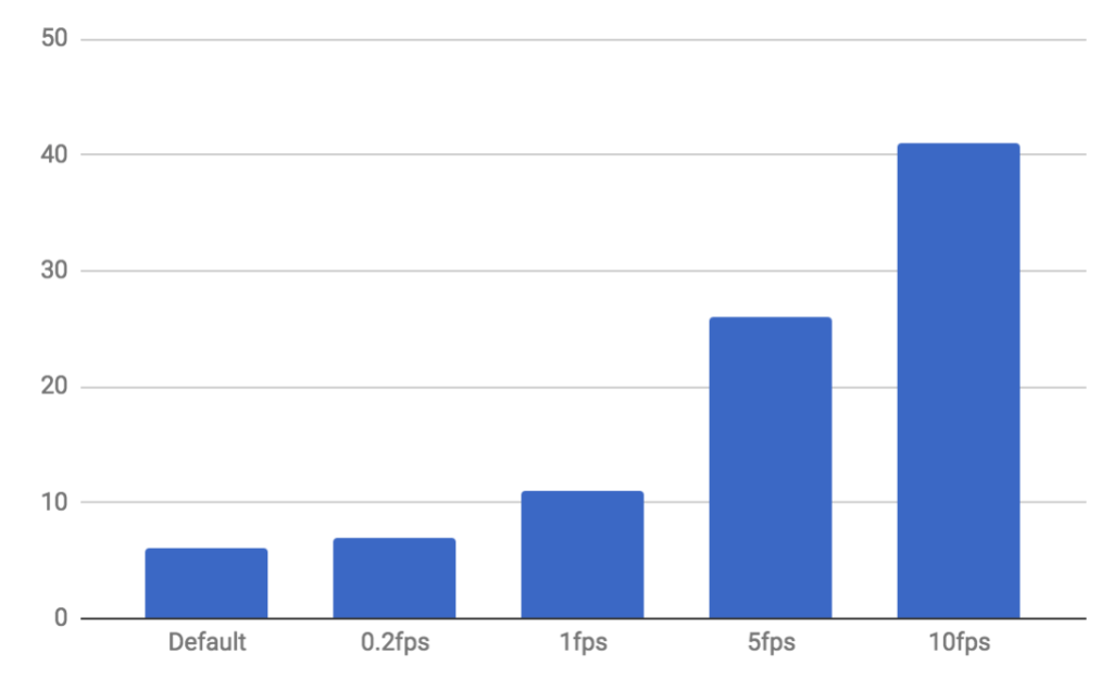 接下来我们将评估CPU使用率。 我们以每秒25帧的速率来处理。 在我们的用例中(以及其他许多情况下),我们不一定需要处理每一帧。 CPU /电池节省对我们来说比检测每一个微笑更重要,因此我们运行了一些测试,修改了我们传递给ML Kit进行识别的每秒帧数。