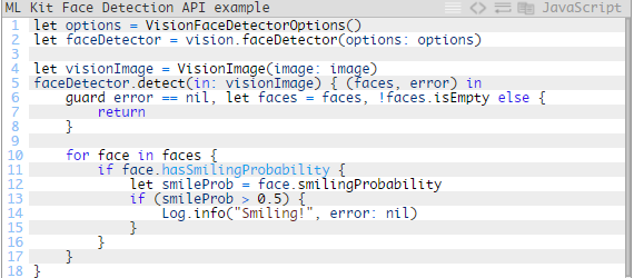 一旦你有了UIImage的框架,你可以将它传递给ML Kit人脸检测器。正如我们稍后在大多数情况下会看到的那样,您只会传递一定比例的帧,以减少对CPU使用率的影响。这是一段代码,展示了访问ML Kit API的容易程度: