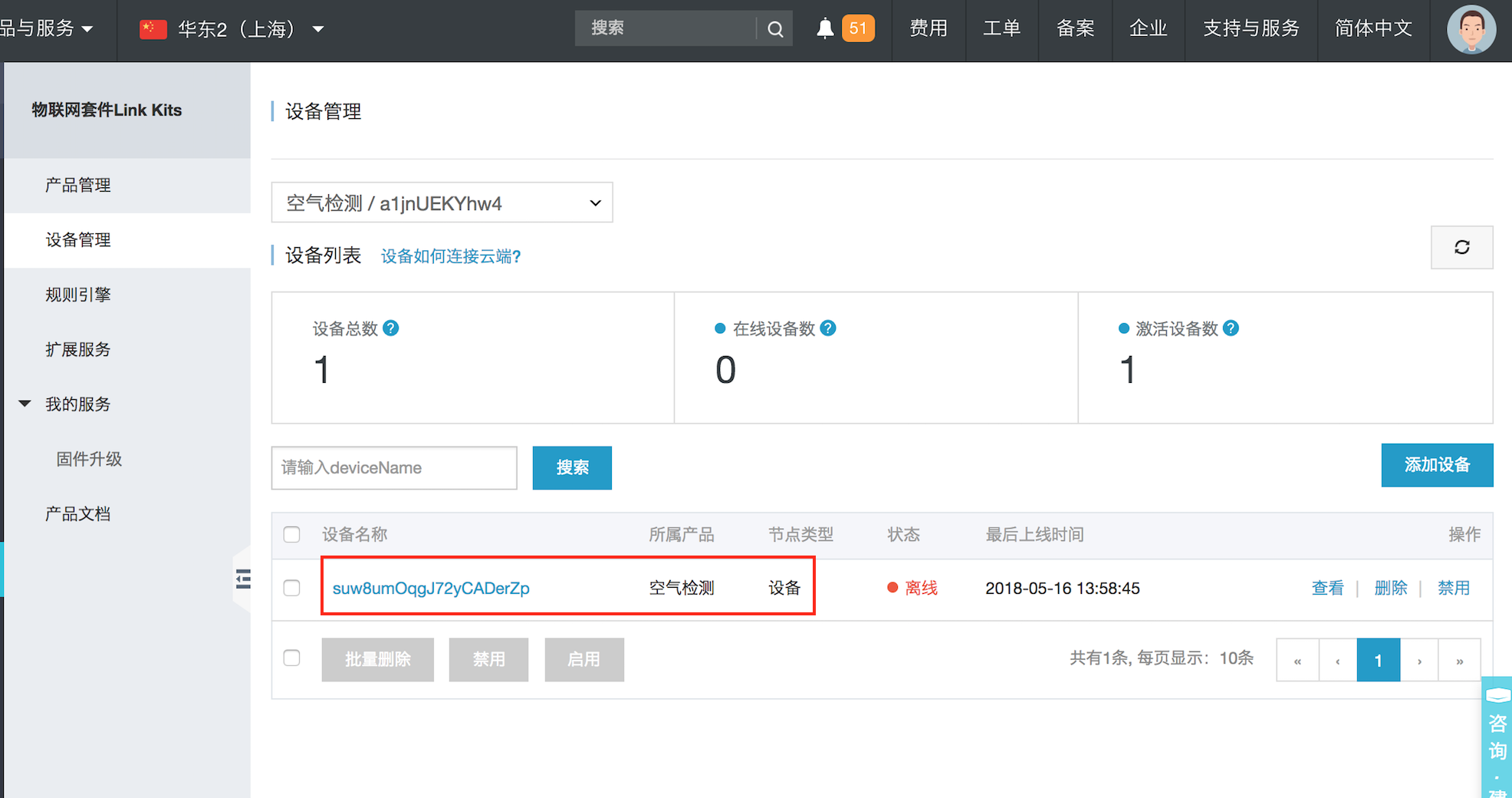 我们在阿里云IoT控制台,设备管理里空气检测产品下添加一个具体设备。
