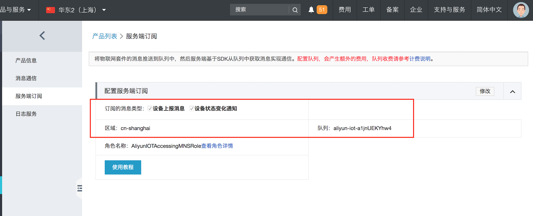 我们在阿里云IoT控制台,为空气检测产品开通服务端订阅,勾选设备上报消息和设备状态变化通知,开通后会有MNS的区域:cn-shanghai和队列信息:aliyun-iot-a1jnUEKYhw4,如下。