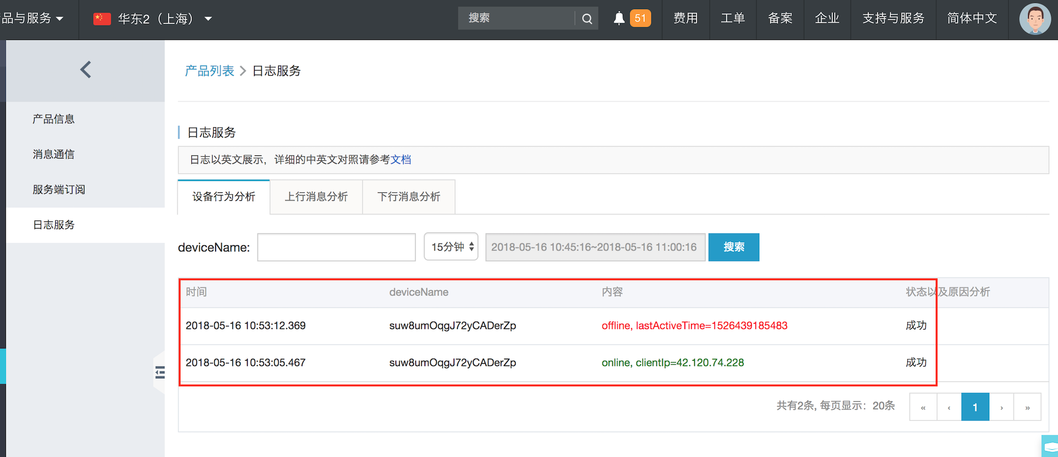 脚本执行后,我们在IoT云端控制台产品-日志服务里查看设备行为分析日志,根据时间顺序,我们看到