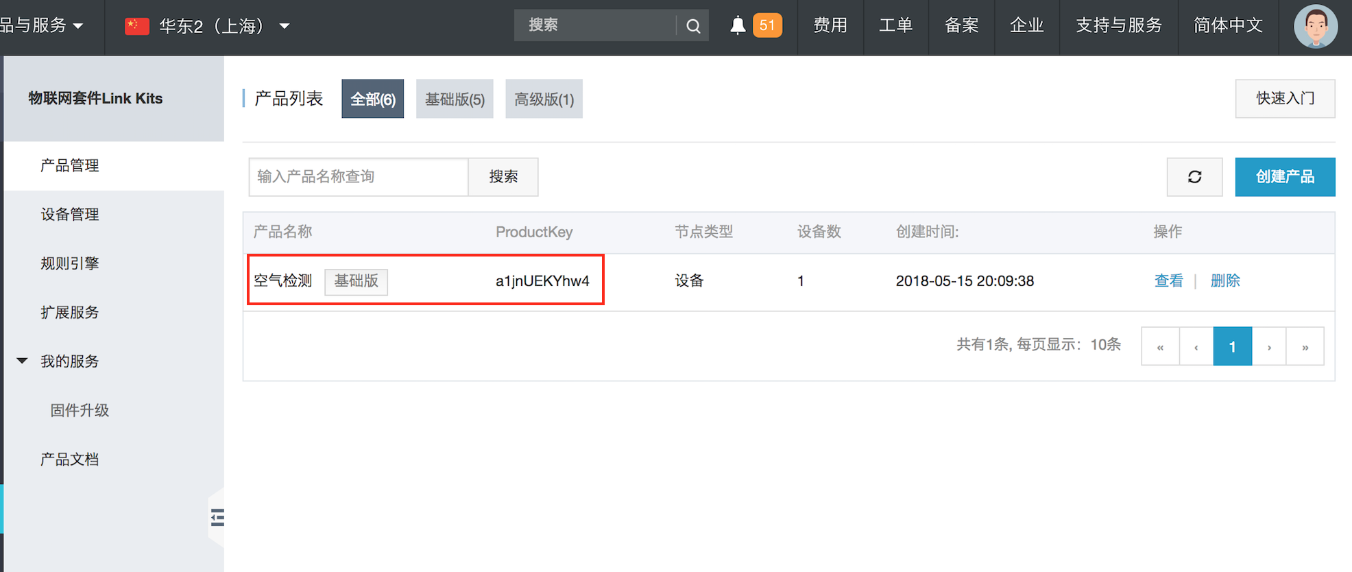 我们在阿里云IoT控制台,创建产品:空气检测,选择基础版。