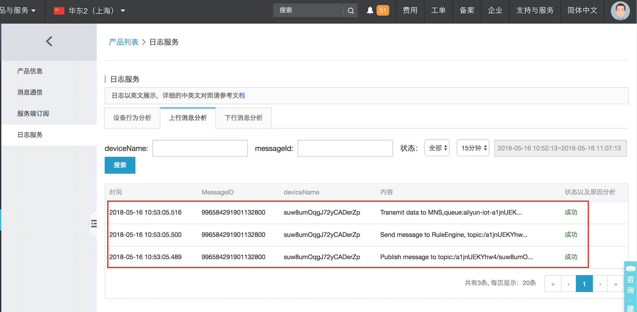 查看设备上行消息分析日志,根据时间顺序,我们看到