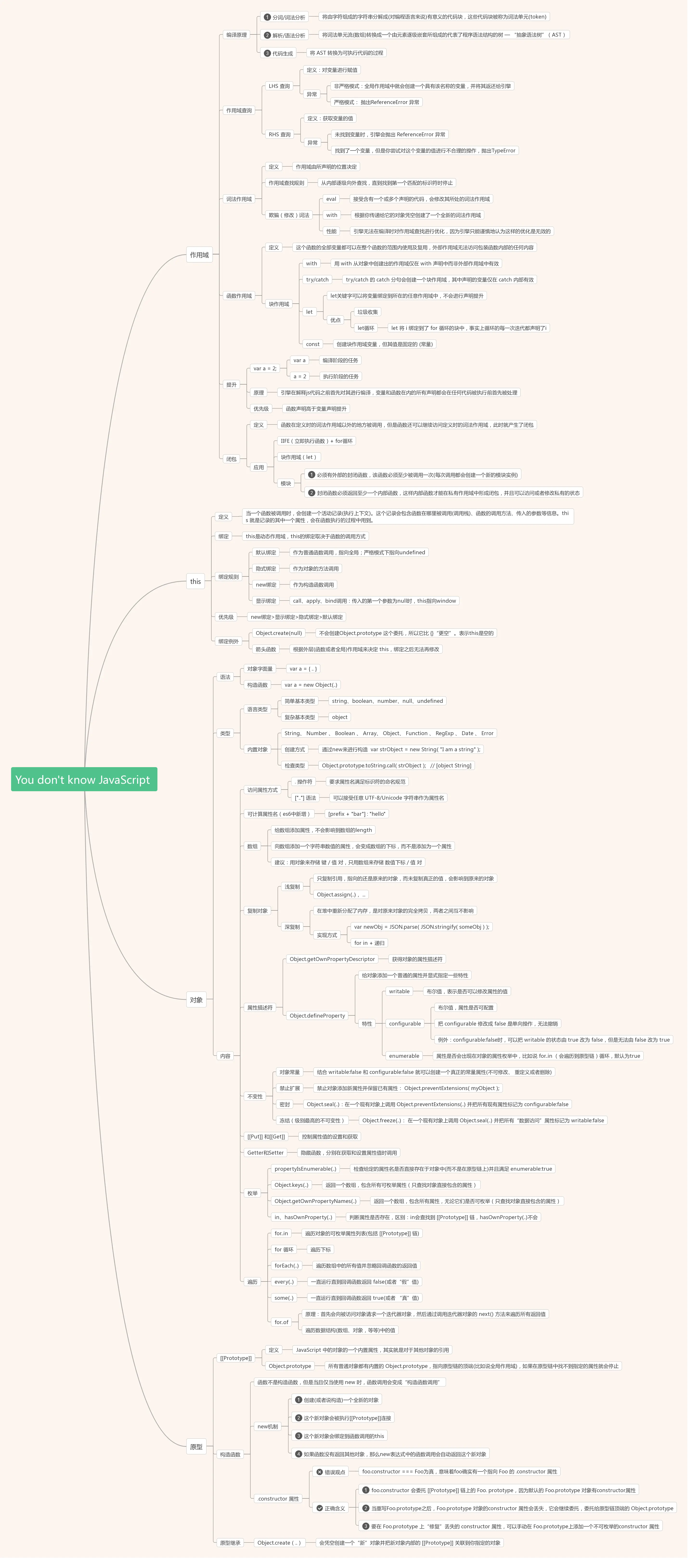 《你不知道的JavaScript(上卷)》——最全思维导图 段亦心 2018-06-27 1,298 阅读1分钟 贴上来的图片被压缩了,看不太清楚,可以点击思维导图原图链接看高清无码的图片😊 也可以在我的github下载png图片和pdf版本