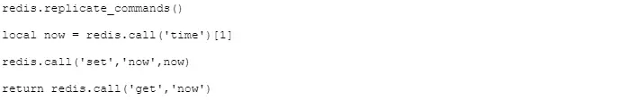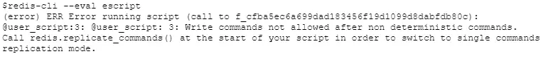 错误提示也很明显,如果执行过非确定性命令(也就是TIME,因为时间是随机的),Redis就不允许执行写命令,以此来保证数据一致性。那如何才能实现随机写入呢?刚才的错误提示也给出了答案,使用redis.replicate_commands(),在执行redis.replicate_commands()之后,Redis就不再是把整个Lua脚本同步给slave和持久化,而是把脚本中调用Redis的写命令直接去做复制,那么slave和持久化也可以得到确定的结果。