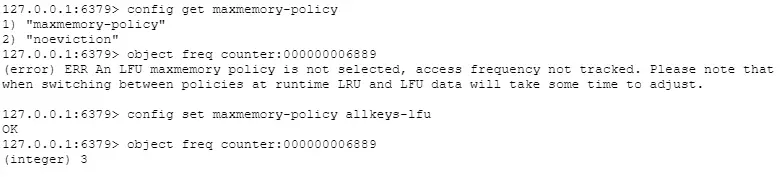 使用OBJECT FREQ命令即可获取指定key的访问频率,不过需要首先把内存逐出策略设置为allkeys-lfu或者volatile-lfu: