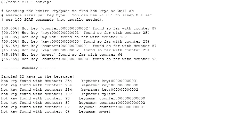 使用scan命令遍历所有key,再通过OBJECT FREQ获取访问频率并排序,即可得到热点key。为了方便用户使用,Redis自带的客户端redis-cli也提供了热点key发现功能,执行redis-cli时加上--hotkeys选项即可,示例如下: