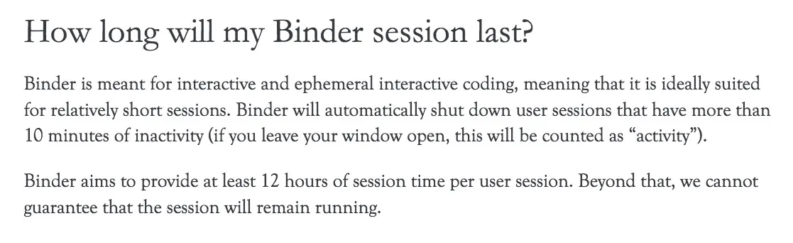 mybinder 平台和用户的约定,是如果你超过十分钟“不活跃”(inactivity),系统就会关闭你的会话(session),以回收资源,服务更多有需要的用户。