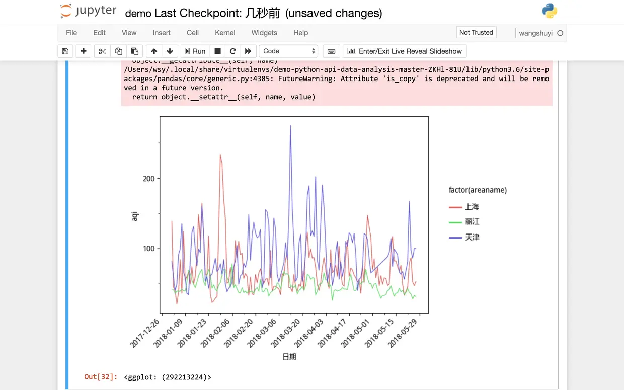 替换之后,点击菜单栏中的“Cell”,选择“Run All”,看能否正常运行全部代码,并且显示分析结果图形。