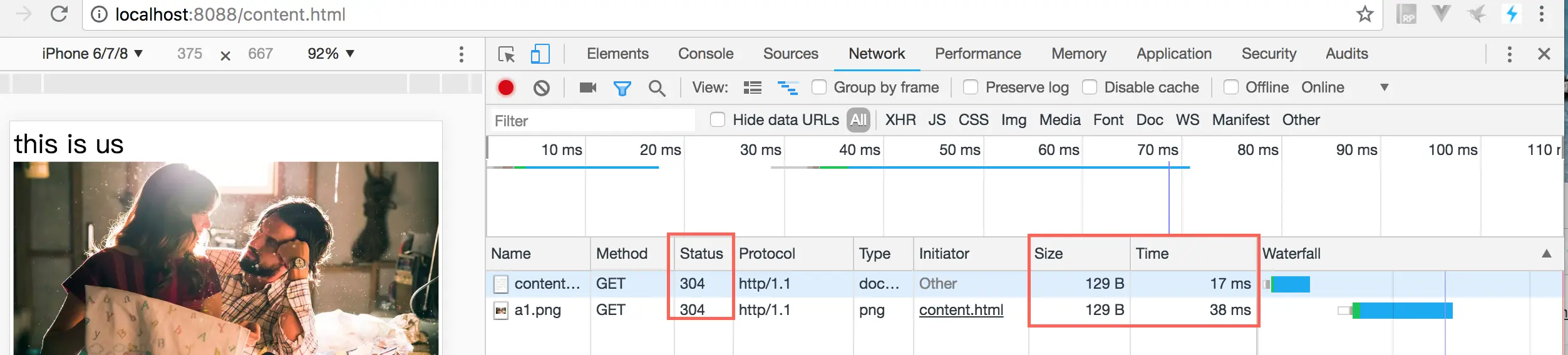 当再次访问的时候我们需要判断一下,if-none-match带的值于现在etagStr值是否一致。如果一致直接返回304,不用在返回文件。浏览器看到304,就知道了要从缓存中拿。