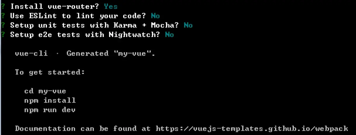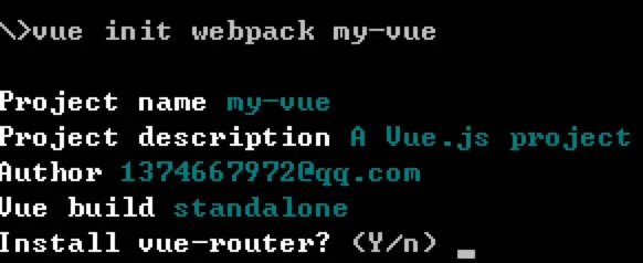 进入文件夹之后,输入命令 vue init webpack vue-demo (vue-demo是文件夹的名字,你可以改成你自己的项目的名字),回车,一直回车,直到出现是否要安装vue-router