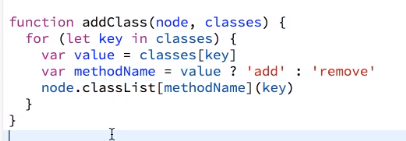 用Dom的方法给一个节点添加或减少类一般用Element.classList.add(或remove)("xxx","xxx"),虽然可以同时增加或移除多个类,但add和remove必须要分开执行,不能在add的同时执行remove操作,下面进行改进:第一步:可以把需要添加或移除的类放到一个空对象里作为键名,健值为true,意为添加,健值为false,意为移除。