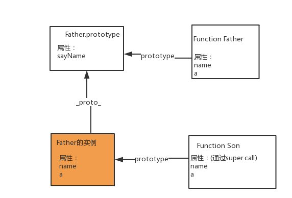 function Father() { this.v = "father"; this.aa = [1,2]; } function Son() { this.a = "son"; } Son.prototype = new Father(); var son1 = new Son(); var son2 = new Son(); son1.aa.push(3);//改变son1的原型的数组也会改变son2 console.log(son1.aa);//[ 1, 2, 3 ] console.log(son2.aa);//[ 1, 2, 3 ]这种方法就是要注意给子类的原型添加方法时,不用采用字面量形式,防止覆盖了子类的原型对象;