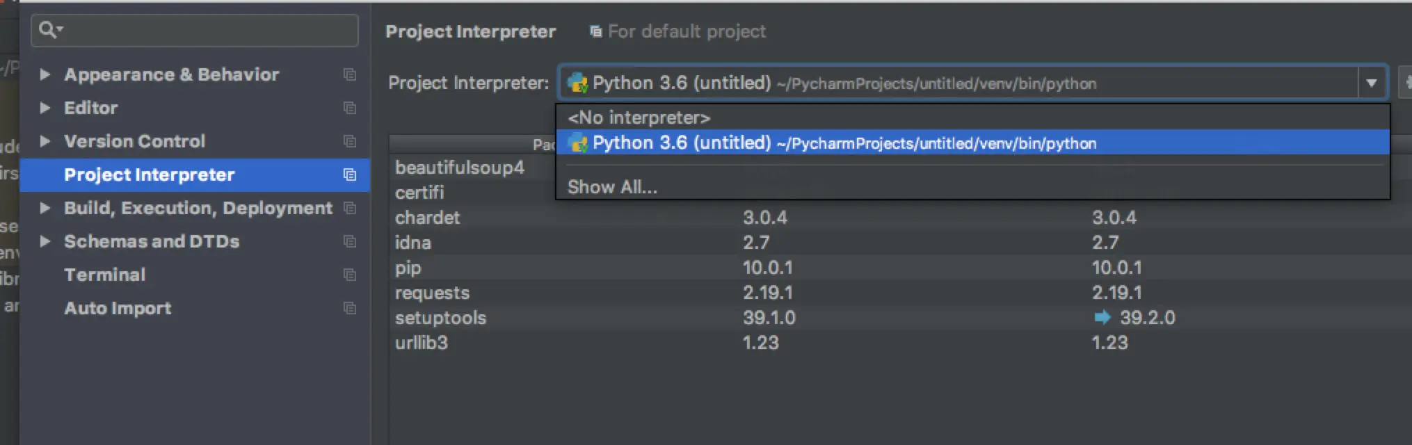 - 选择左侧的 Project Interpreter选项,在窗口右侧选择Python环境