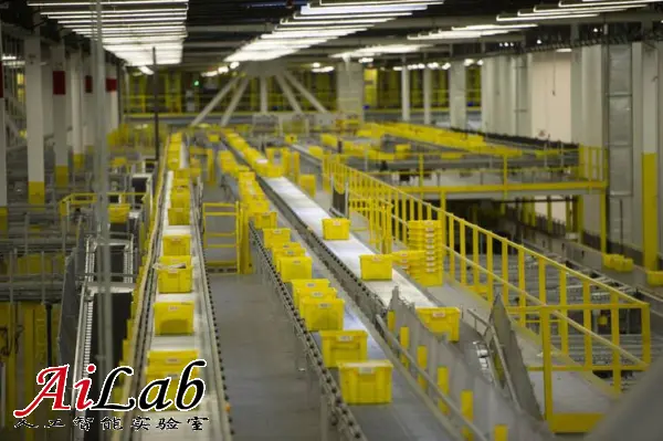 图示:亚马逊公司货物传运带上的货品箱,位于加州特雷西市的物流中心