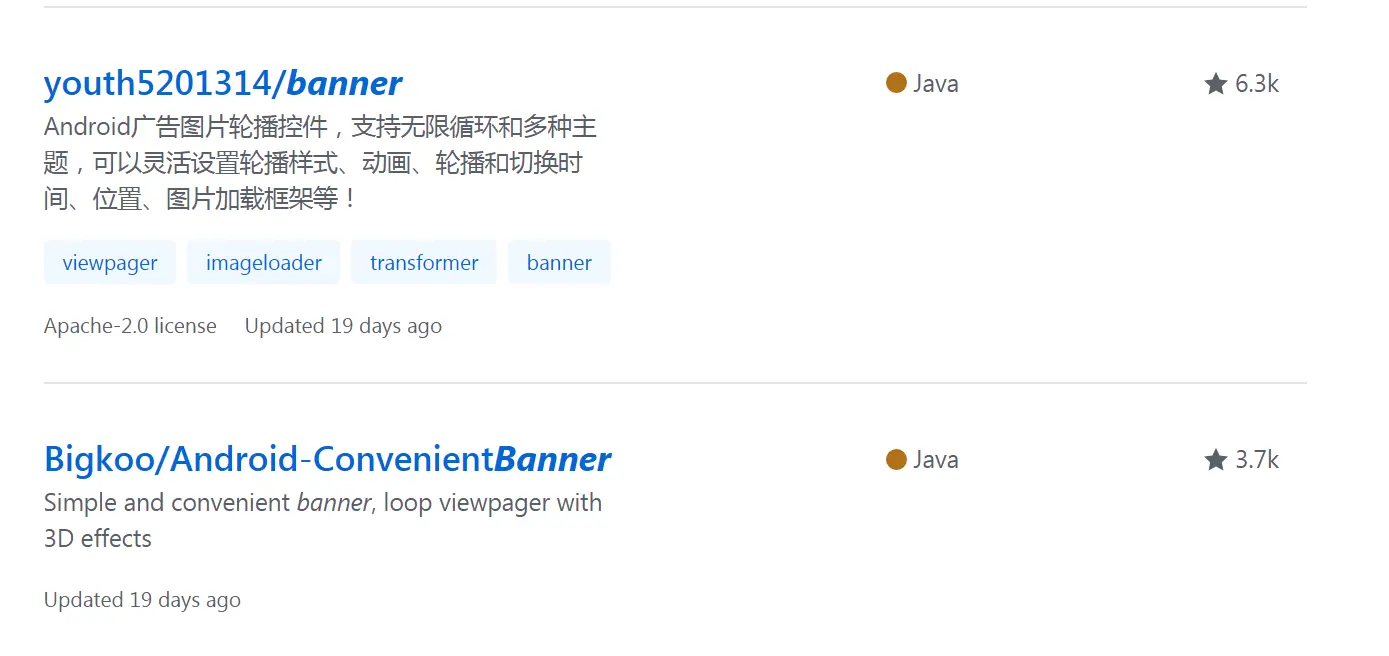 在github中搜索banner,star前两名的如下图,楼主都用过没用过的可以试试不过多评价自己可以看看Issues,提一嘴今天改造的是ConvenientBanner,这个库最早是用ViewPager写的,最新版本是用RecyclerView写的,咱们用的是老版本ViewPager,废话少说,开干。