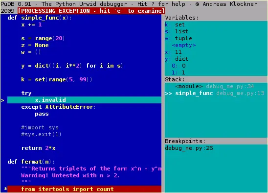 14、pudb:基于控制台的全屏 Python 可视化调试器。比 pdb 好用太多了,特性:
