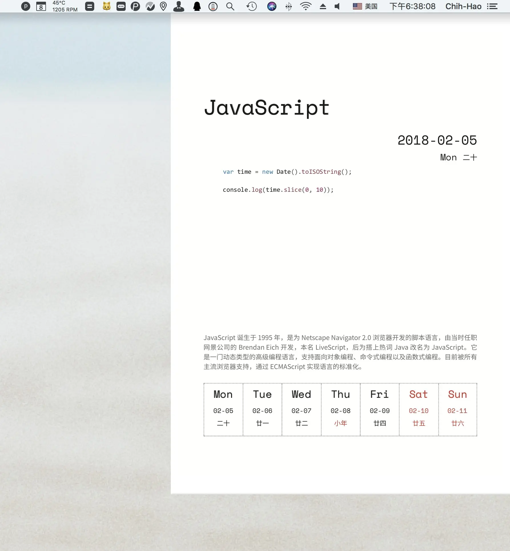 17、TuringCalendar:图灵教育推出的限量款编程日历 2018,因为简约大气的设计和每周一个编程语言的介绍,在程序员中广受欢迎。现在日历 PDF 的源文件已经该源,于是就有了这个项目。一个 macOS 桌面上的日历 widget,效果图如下: