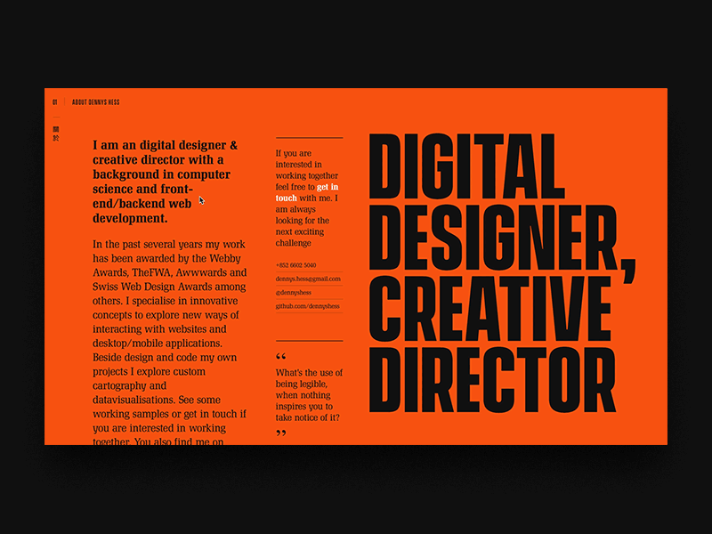 这是一个典型的个人作品集网站设计,集合人物设计、个人简介、作品展示、成就展示于一体,是一个单纯以作品和经验说话的经典网页设计案例。即使网页设计本身是15年的作品,但它的设计思路仍旧值得学习。动效的运用,例如,悬浮式的滚动设置,使网页的焦点由人物切换到个人经历和作品展示,以今天的设计观念看来,仍不过时。