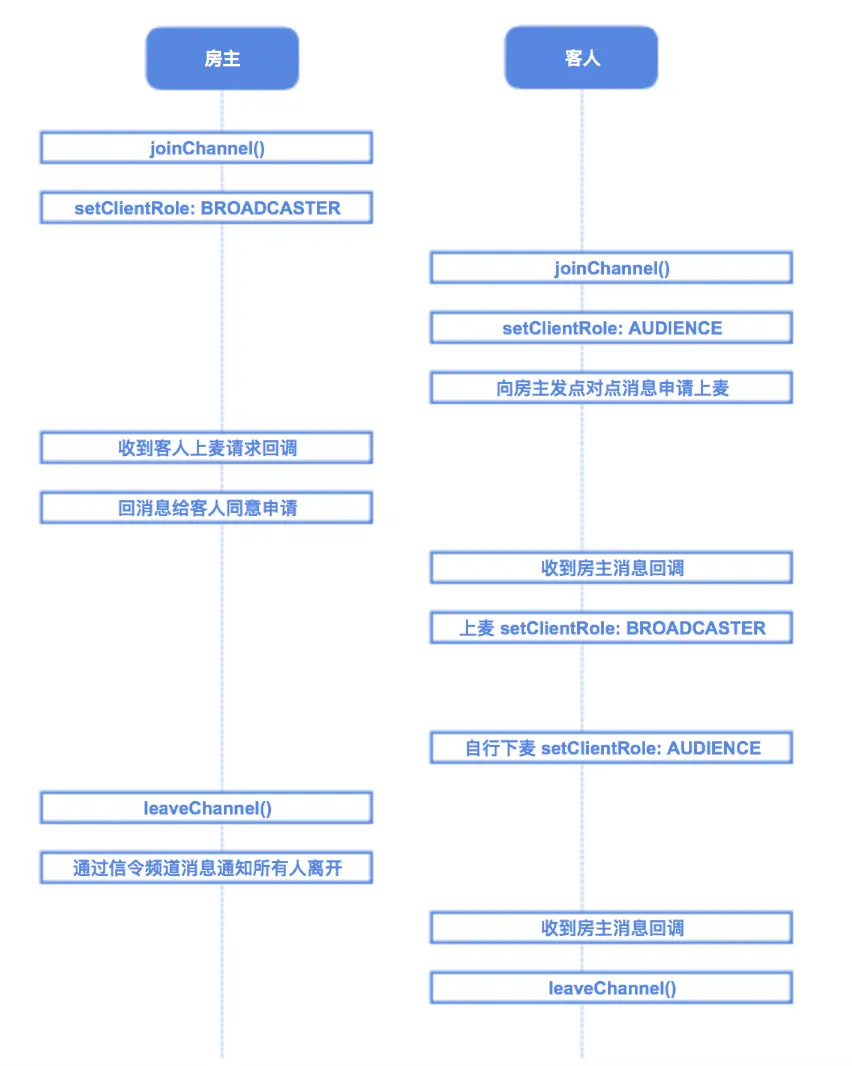通常,观众上麦请求、主播通过上麦申请等一系列操作都是通过消息服务来完成的。当观众发出上麦请求,并得到了房主的上麦许可后,只需要通过 setClientRole 将该观众设定为 Broadcaster ,即可上麦。这时,我们就完成了连麦的功能。当观众下麦的时候,同样地,将其身份修改会 Audience 即可。