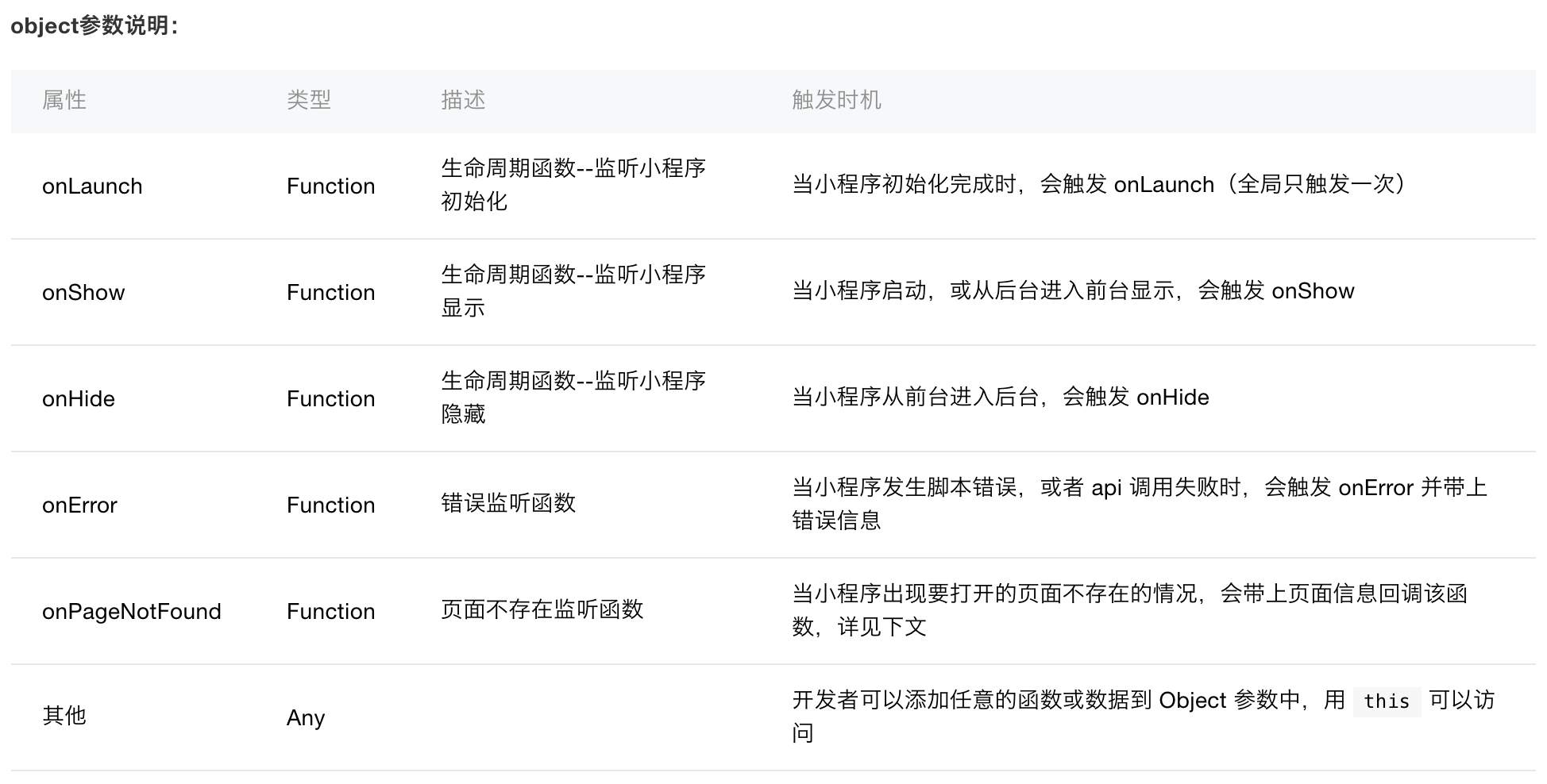 根据微信小程序开发文档,App() 函数用来注册一个小程序,接收一个 object 对象参数,其指定小程序的生命周期函数等。我们从微信开发者工具的函数提示可以知道,App() 函数的声明如下: