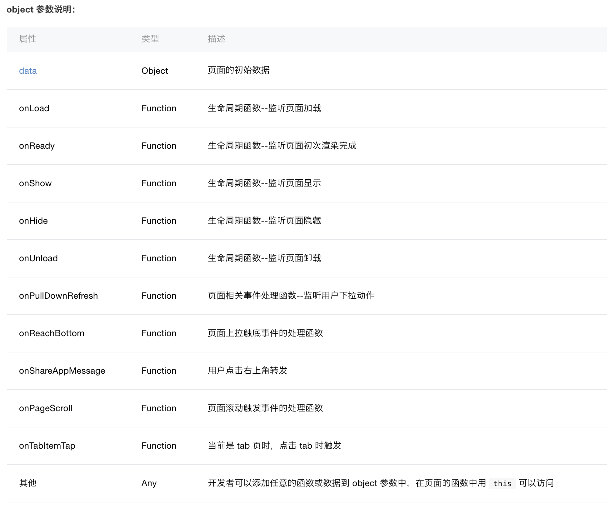 根据文档,Page() 函数用来注册一个页面,接收一个 object 对象参数,其指定页面的初始数据、生命周期函数、事件处理函数等。Page() 函数的声明如下: