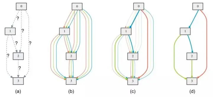 图 1:DARTS 概述:(a)一开始并不知道对边缘的操作。(b)通过在每个边缘放置各种候选操作来连续放宽搜索空间。(c)通过求解二级(bilevel)优化问题,联合优化混合概率和网络权重。(d)从学习到的混合概率中归纳出最终的架构。