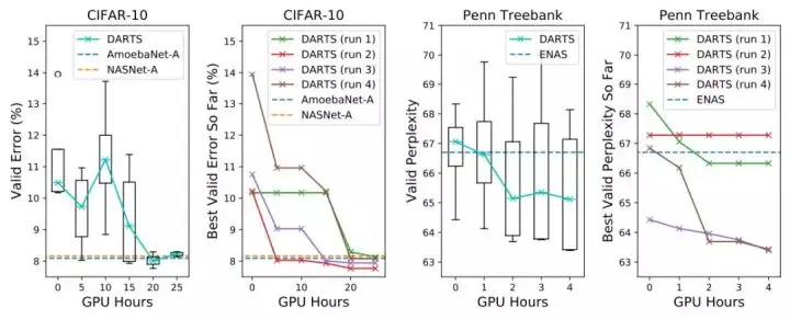 图 3:CIFAR-10 卷积单元和 Penn Treebank 循环单元的 DARTS 搜索进展。随着时间的推移,该方法会持续追踪最新的架构。每个架构的瞬象(snapshot)都使用训练集从头开始重新训练(CIFAR-10 上的 100 个 epoch 和 PTB 上的 300 个 epoch),然后在验证集上进行评估。对于每个任务,我们用不同的随机种子重复实验 4 次,并随着时间的推移报告架构每次运行的中值和最佳验证性能。作为参考,我们还报告了(在相同的评估设置下;具有可比较数量的参数)通过进化或使用强化学习发现的最佳已有单元的结果,包括 NASNet-A(Zoph 等,2017)(1800 个 GPU 工作天数),AmoebaNet-A(3150 个 GPU 工作天数)(Real 等,2018)和 ENAS(0.5 个 GPU 工作天数)(Pham 等,2018b)。