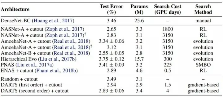- 在图像分类和语言建模任务上进行的大量实验表明:基于梯度的架构搜索在 CIFAR-10 上获得了极具竞争力的结果,在 PTB 上的性能优于之前最优的结果。这个结果非常有趣,要知道目前最好的架构搜索方法使用的是不可微搜索方法,如基于强化学习(Zoph et al., 2017)或进化(Real et al., 2018; Liu et al., 2017b)的方法。
