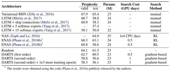 - 达到了优秀的架构搜索效率(使用 4 块 GPU:经过 1 天训练之后在 CIFAR-10 上达到了 2.83% 的误差;经过六小时训练后在 PTB 达到了 56.1 的困惑度,研究者将其归功于基于梯度的优化方法)。