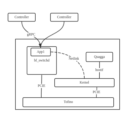 Quagga等Userspace的程序就通过hostif虚拟网卡上的IP和上级路由器跑BGP,再将学习到的路由写到Kernel的路由表。我们直接开发的APP模块以bf_switchd插件的方式加载,通过netlink接口学习Kernel的ARP表、路由表,调用P4代码编译后生成的API写入Tofino芯片。