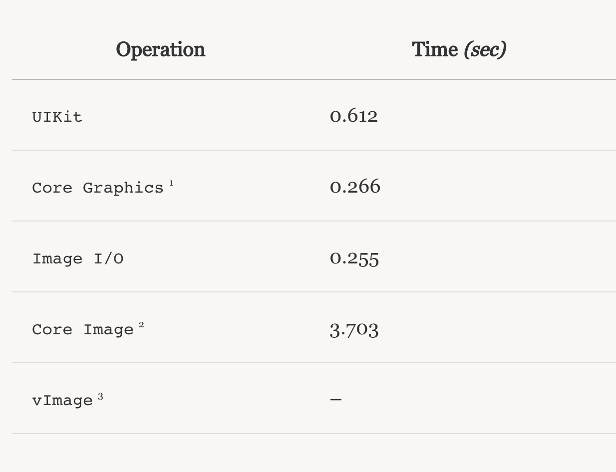 CoreGraphics / Quartz 2D提供了一套较低级别的API,允许进行更高级的配置。 给定一个CGImage,使用临时位图上下文来渲染缩放后的图像。 使用CoreGraphics图像的质量与UIKit图像相同。 至少我无法察觉到任何区别,并且imagediff也没有任何区别。 表演只有不同之处。